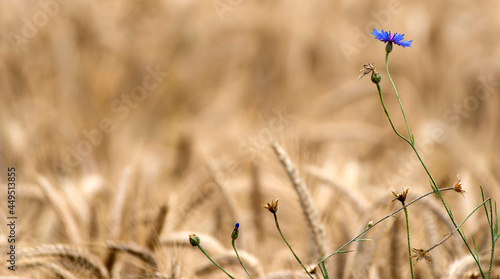 Fototapeta premium Bleuet isolé dans les blés à Augisey, Jura, France