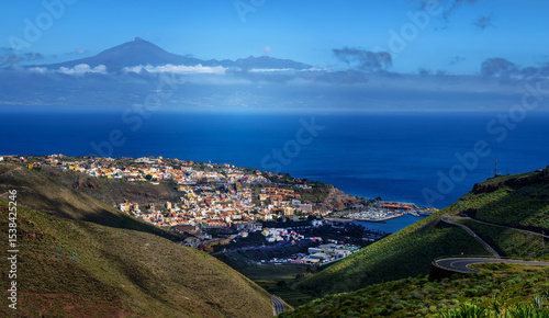 Fototapeta premium Blick am frühen Morgen vom Mirdor Lomada dell Capello auf die Inselhauptstadt San Sebastian de la Gomera; im Hintergrund der Pico del Teide (Tenerife) auf der rechten Bildseite eine Serpentinenstraße