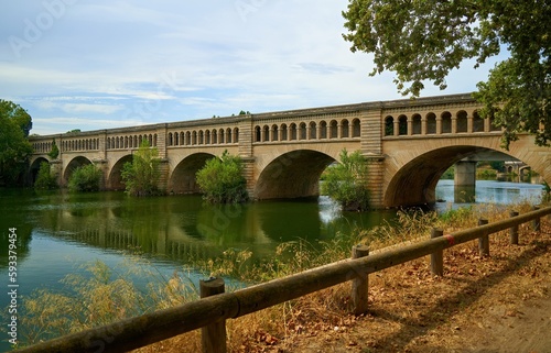 © Samuel, Naklejka premium Blick auf das Orb-Aquädukt, eine Brücke, die den Canal du Midi über den Fluss Orb bei der Stadt Béziers im Languedoc-Roussillon, Süd-Frankreich, führt.