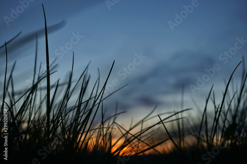 © Revilo Lessen, Fototapeta premium Blick auf de Sonnenuntergang durch Gras