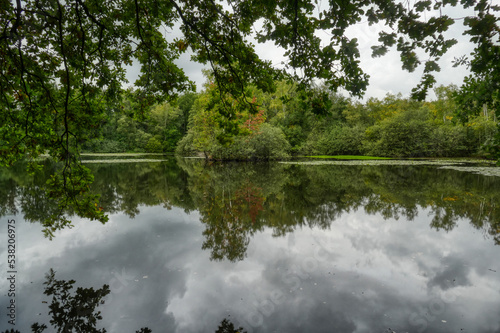 © hespasoft, Fototapeta premium Blick auf den Leyenweiher in der Wahner Heide im Herbst