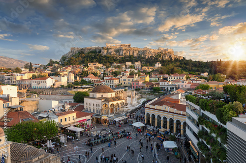 © moofushi, Obraz premium Blick auf den Parthenon Tempel der Akropolis und die Altstadt Plaka von Athen bei Sonnenuntergang
