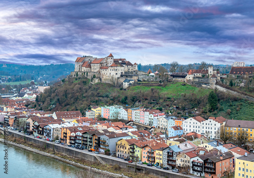© pwmotion, Obraz premium Blick auf die Altstadt und Burg, Burghausen, Bayern, Deutschland