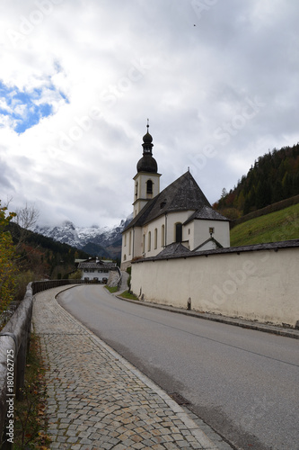 Fototapeta premium Blick auf die Pfarrkirche St. Sebastian in Ramsau , Bayern, Deutschland.