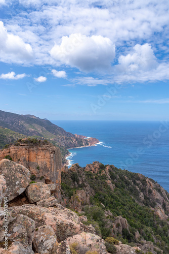 Fototapeta premium Blick über die abendliche Felsenlandschaft der Calanche auf Höhe von Porto,...