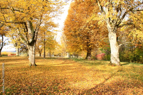 © Horst Bingemer, Fototapeta premium Blick durch die Lindenallee auf der Friedenshöhe in Flacht im Herbst