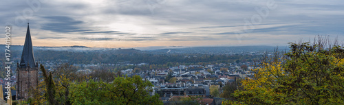 © Winfried, Obraz premium Blick im Morgennebel über Stadt Marburg vom Burghof aus nach unten