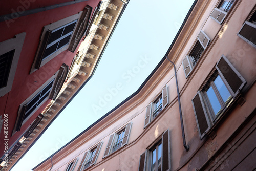 © finecki, Obraz premium Blick in den Himmel in einer Altstadtgasse in Mailand, Italien