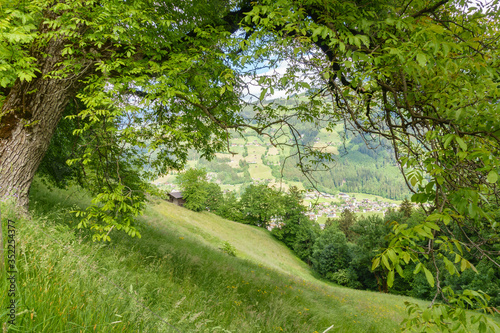 Obraz premium Blick untereinem Baum aufs Zillertal in Tirol