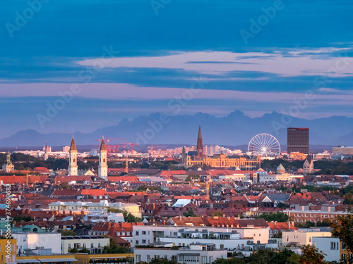 Obraz premium Blick vom Olympiaberg, Kirche St. Benno in Neuhausen und Paulskirche vor Alpenkette, München, Bayern, Deutschland, Europa