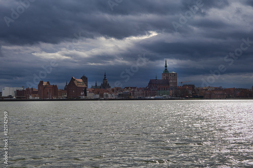 © Mark Lämmchen , Obraz premium Blick vom Schiff, Boot auf die Hafeninsel, Himmel mit Wolken, Stralsund, Mecklenburg Vorpommern, Deutschland