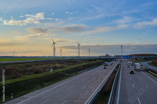 © Gerrit, Fototapeta premium Blick von einer Brücke auf eine Autobahn, im Hintergrund stehen mehrere Windräder im Sonnenuntergang