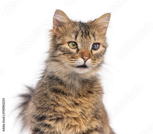 Obraz premium blind in one eye kitten posing on white background, adorable pet with unique...