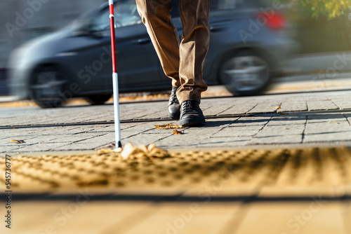 © thomsond, Fototapeta premium Blind man close-up with a walking stick crosses the road in front of a passing car