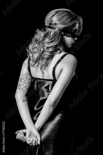 © patronestaff, Fototapeta premium Blindfold woman with hands behind her back black and white