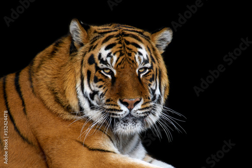 © byrdyak, Fototapeta premium Bliska duży tygrys na białym tle na czarnym tle