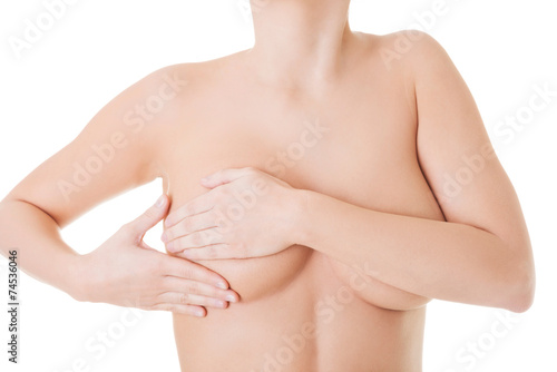 Fototapeta premium Bliska naga kobieta bada jej piersi