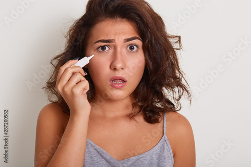 © sementsova321, Fototapeta premium Bliska portret pięknej młodej kobiety trzymającej krople do oczu, brunetka myśli o używaniu leków, modelka patrząc na kamery z przestraszonym wyrazem twarzy, ubrana na co dzień, o ciemnych falujących włosach.