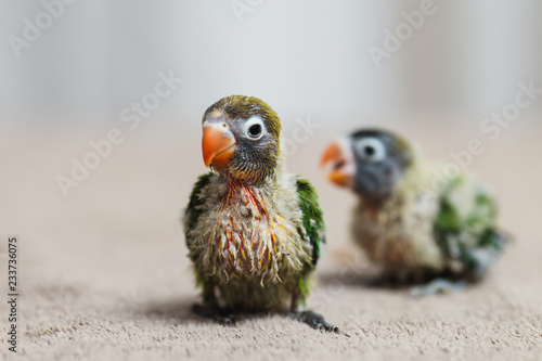 © Dusko, Naklejka premium Bliska strzał pięknych miniaturowych piskląt nierozłączek Fischera bawią się i szukają karmienia.