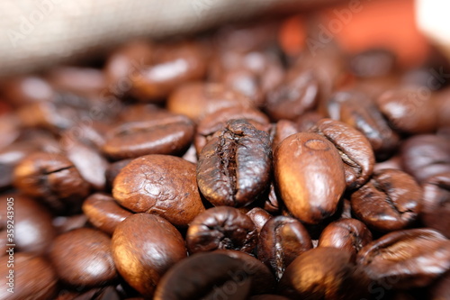 © WS Studio 1985, Naklejka premium bliska ziaren kawy i makro ziaren kawy na tle tabeli drewna
