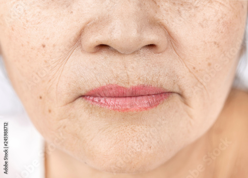 © F16-ISO100, Fototapeta premium bliska zmarszczek skóry i piegi starej twarzy azjatyckiej kobiety