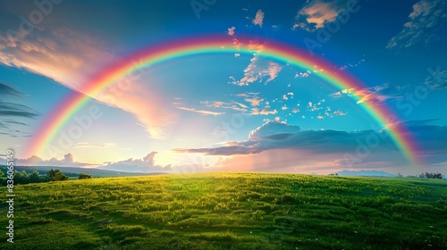 Naklejka premium Blissful Rainbow: Colorful Arc Over Verdant Field and Blue Sky