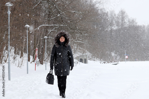 © Oleg, Fototapeta premium Blizzard in winter city, picturesque view. Lonely woman walking in park during snowfall on frozen lake background
