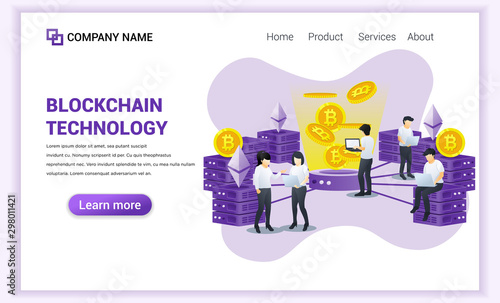 © agny_illustration, Obraz premium Block chain technology concept with people working on laptop. Mining Industry Cryptocurrency. Can used for Web banner, landing page, web template. Modern flat vector illustration