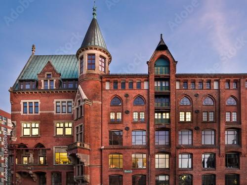Fototapeta premium Block O in der HAmburger Speicherstadt am Abend entzerrt