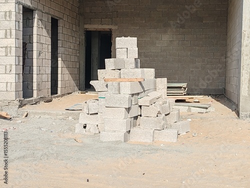 Obraz premium Block or Tabook, Concrete block on construction site, Cement blocks pallet. Cement bricks for building construction. Concrete block or cement block on construction site used for construct villa's