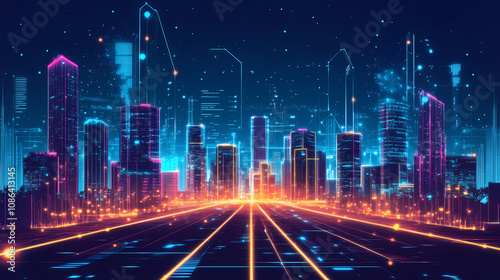 Fototapeta premium Blockchain-driven city infrastructure, neon-lit pathways, futuristic city design. Futuristic Cityscape Vision. Illustration