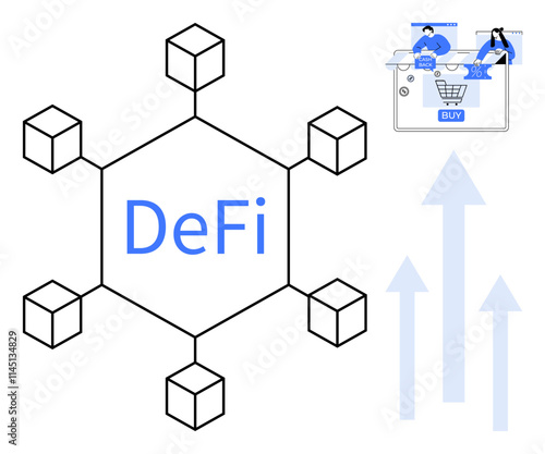 Fototapeta premium Blockchain nodes interconnected around DeFi text on left e-commerce buying icons and upward arrows on right. Ideal for financial technology, e-commerce, growth, blockchain, cryptocurrency