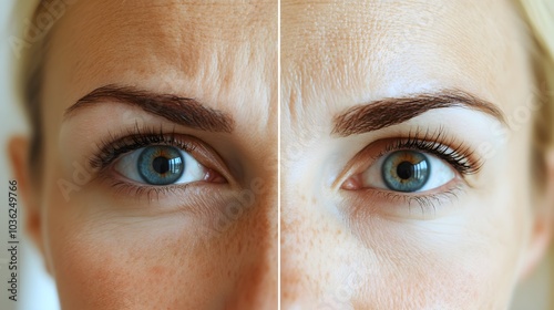 Fototapeta premium Blog post on Botox for facial rejuvenation, featuring detailed before-and-after photos of the forehead and eyes, illustrating wrinkle removal and skin smoothing, Photorealistic