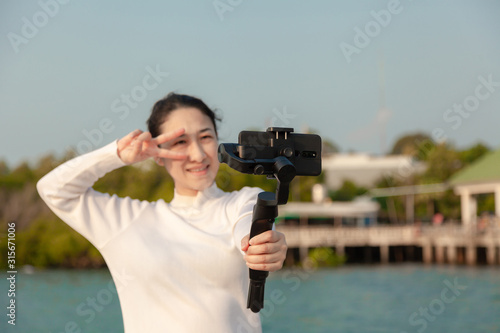 © Nitiphonphat, Obraz premium Blogger Asian woman record vlog video and sharing content on streaming platform with Social Network. female enjoy in front of camera using mobile phone make vlogging live feeds on social media network