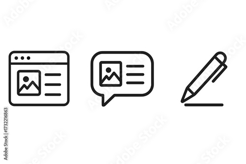 © Fabian, Fototapeta premium Blogging and content creation vector icon set. Web page with article, blog post, writer pen symbol. Speech bubble for comment. Vector illustration for UI design, website, app.