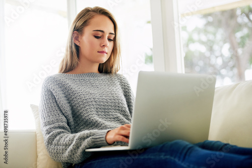 © Koegelenberg/peopleimages.com, Naklejka premium Blogging his her new favourite hobby. Cropped shot of an attractive young woman using her laptop while chilling at home.