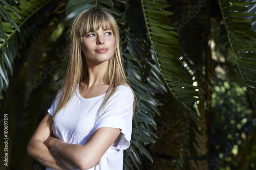 Fototapeta premium Blond beautiful woman by palm tree, looking away