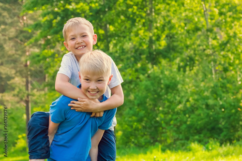 © R, Fototapeta premium Blond chłopiec siedzi na plecach znajomego w parku