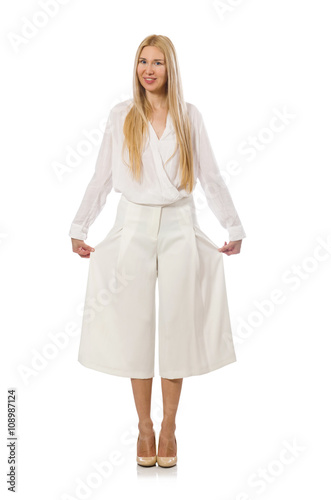 Fototapeta premium Blond hair model in elegant flared pants isolated on white