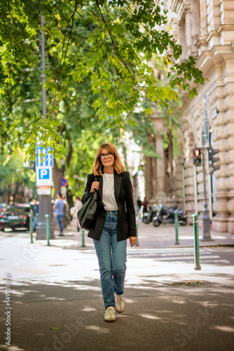Naklejka premium Blond haired woman walking on the city street on an autumn day