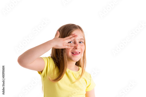 Fototapeta premium Blond indented kid girl hiding eyes with fingers