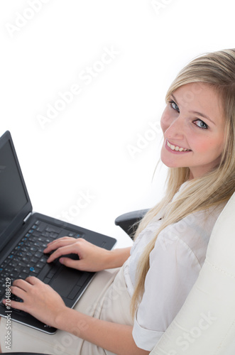 © 20:20, Naklejka premium Blond Woman with Laptop Smiling Up at Camera