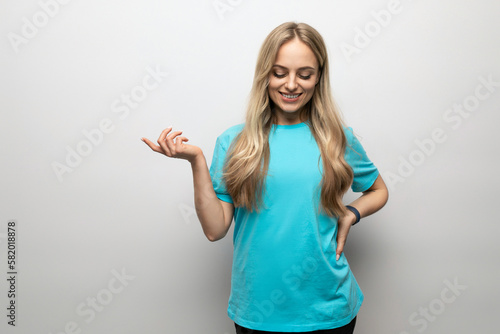 Fototapeta premium blond young woman in a blue t-shirt points to an empty space on a white...