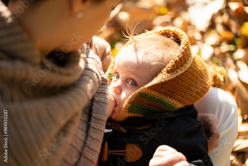 Obraz premium Blonde baby with blue eyes breastfeeding in a park