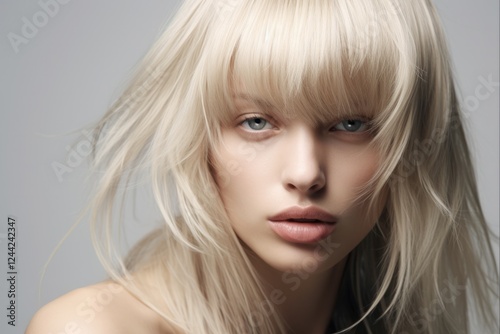 © Vlad, Fototapeta premium Blonde Beauty with Perfect Bangs. Close-up of Model's Coiffure with Forelock. Hair Care Concept on Gray Background