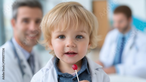 Fototapeta premium Blonde caucasian toddler with lollipop at pediatric checkup with doctors