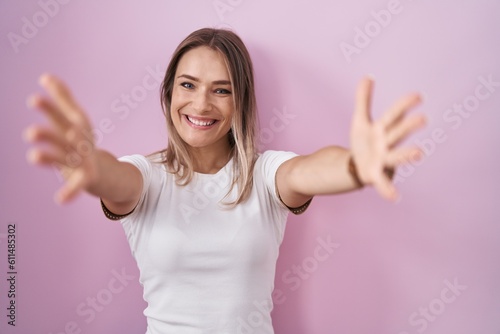 Fototapeta premium Blonde caucasian woman standing over pink background looking at the camera smiling with open arms for hug. cheerful expression embracing happiness.
