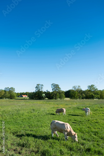 © ahavelaar, Fototapeta premium blonde d'aquitaine cows in rural landscape of twente near enschede and oldenzaal in holland