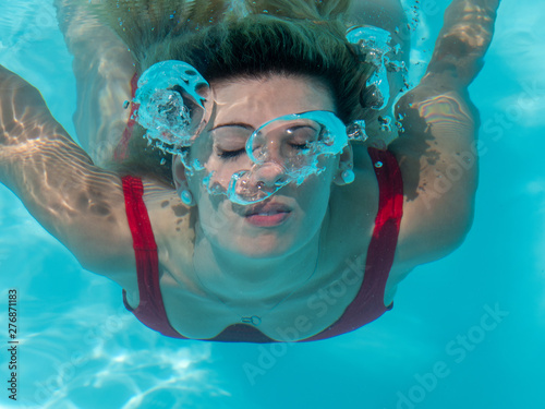 Fototapeta premium Blonde girl diving in the pool and breathing out air to make bubbles.