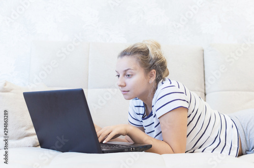 © Petr, Fototapeta premium blonde girl is sitting at home on the couch with a laptop and communicates on the Internet. social networks. dating.